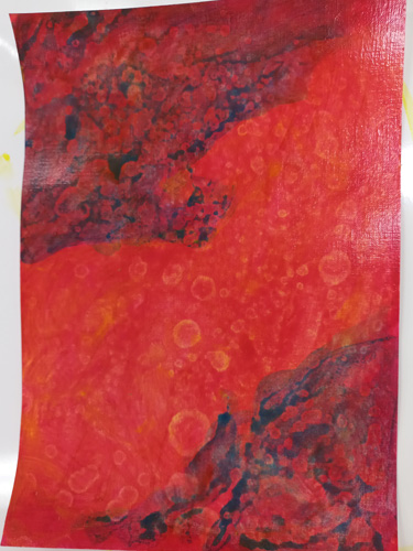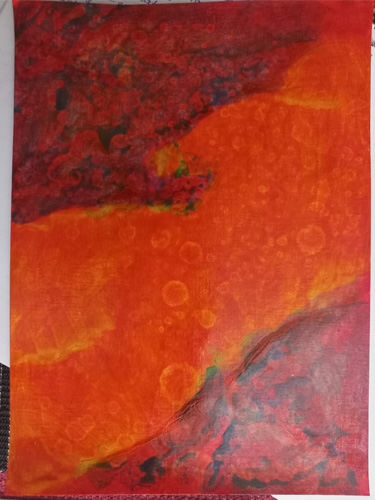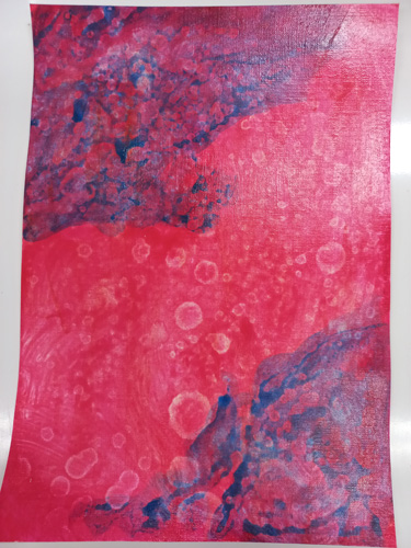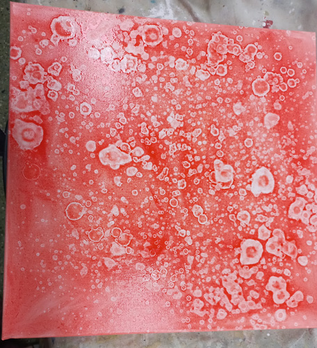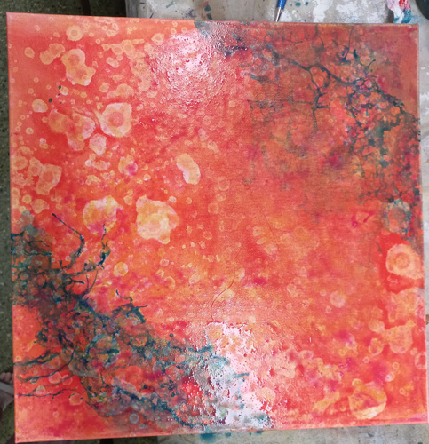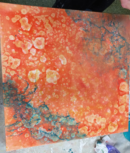 Pete's shared knowledge Preparation and painting Pete prefers a smooth surface so that he, and not the canvas, is in control of the marks. He says he's not a texture person but can emulate it. Always wash new canvases with soapy water to get rid of the sealant added during manufacture as it prevents prevents your paints adhering properly. Instead of gesso he uses four coats of low-sheen acrylic wall paint, which can be wet sanded (to avoid dust). The wall paint seems to melt under wet sanding and it delivers a very smooth surface. You can do pencil on those really smooth canvasses -> fixative -> varnish. A surfactant will slow drying: original Windex on it's own or a drop of detergent in brush water. Use exterior estapol to varnish finished paintings as it doesn't yellow. Pete uses clear acrylic medium to mix with colours as he can do many, many layers. If you need to interrupt a painting session you can put your palette of unused colours in the fridge or freezer until next time. Abstraction The meaning of abstraction in painting is to take something we recognise and put it in a different format. It is to represent something in a new and exciting way. People love gradients of colour. Take a photo in slow motion, e.g. dripping water, using your phone as it will blur the background. Just paint that - place it using tone, form and line. Paint the beauty and emotion of the sunrises and sunsets and then share. Use the largest brushes. Use a spray bottle with metho for texture. Then Pete's pricing is $5.40 per square centimeter - don't discount your work as you do the purchaser and yourself a disservice. What stuff sells: brighter colours, had red in them. Don't let unqualified people tell you what to do with your work or how to do it. Put a wet chux over the drain when cleaning up as it catches the big stuff. It's better off in the bin than in the water system. What we did on the day: First we dampened the canvas and dribbled a small amount of flow paint (red) over the wet canvas. Spray this with metho. Go close and slow for bigger drips. This creates texture such as resist circles (blooms). Dry it with a heat gun to preserve the effect. Use word mapping - what kind of line, what is the story - tone, hue, mass / form, balance, golden ratio (1.618). Add another layer (blue) - clear acrylic painting medium and a little paint and water to glaze part of the canvas. Spray with metho again. Dry with a heat gun to prevent losing the texture.